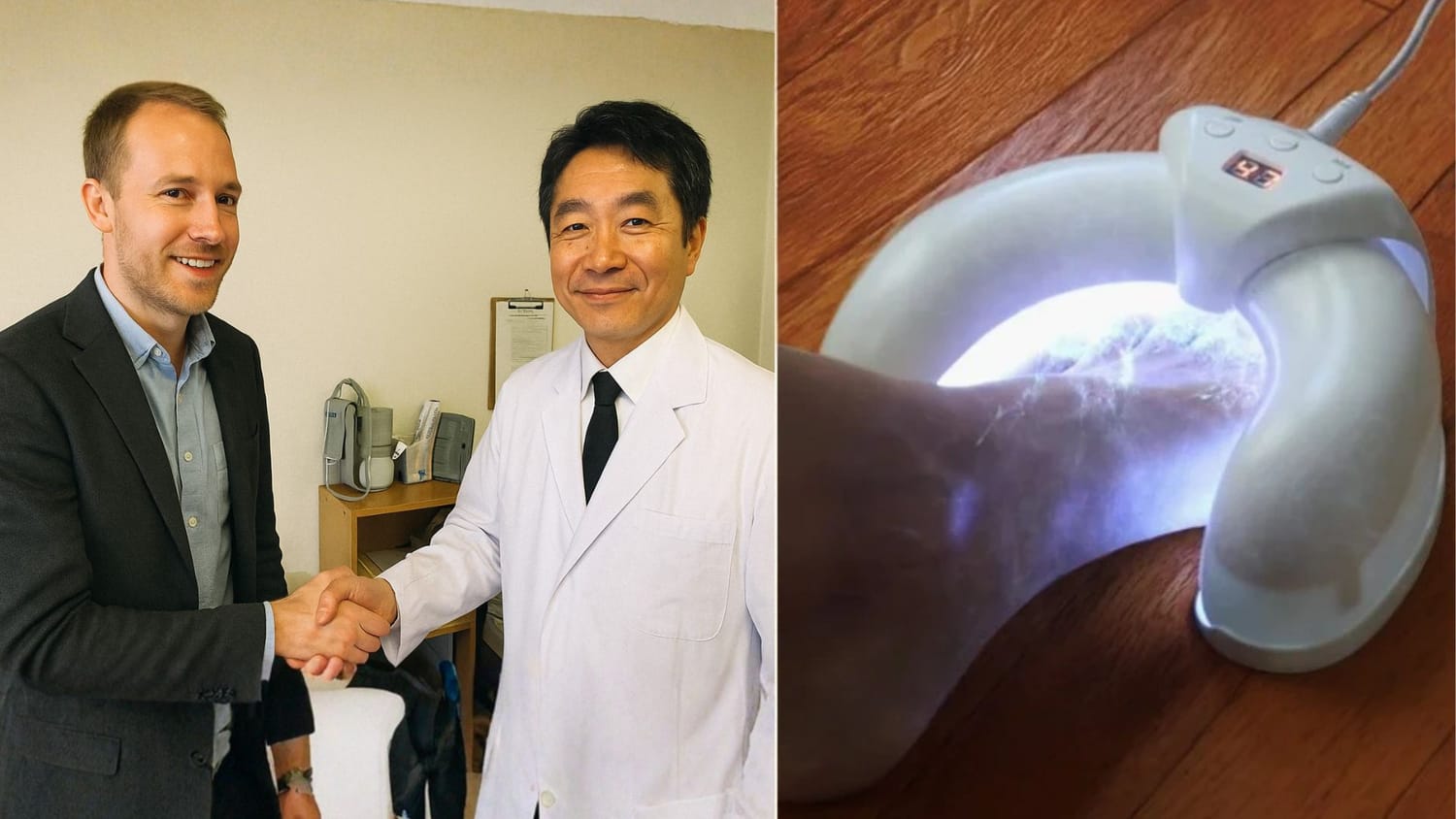 Lors d’un projet de recherche au Japon, il découvre par hasard, dans un petit laboratoire de Tokyo, une méthode locale étonnante : l’association de lumière bleue et infrarouge pour purifier les ongles infectés.